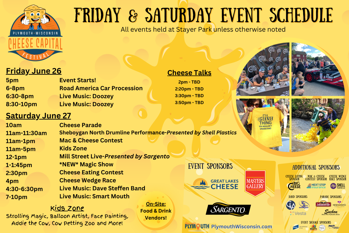 Calling all cheese lovers! Don't miss the Fourth Annual Cheese Capital Festival in Plymouth, WI, the Cheese Capital of the World! Join us on June 26th and 27th for an unforgettable weekend filled with cheesy delights and fun-filled activities.